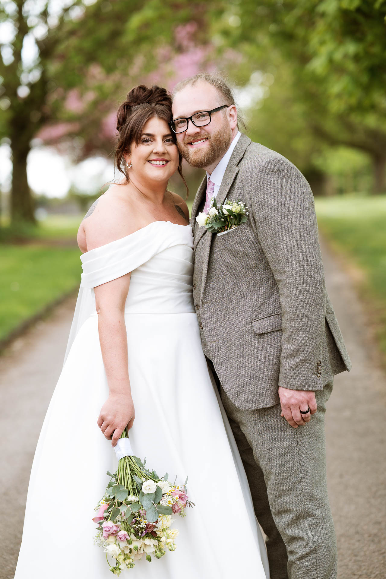 Outside, the spring colours were showing off. Green trees, blossom popping in the background, and that soft light that makes everything feel extra dreamy. Skye and Ben wandered down the path together, holding hands and throwing big smiles back at the camera – one of those ‘we did it!’ moments.
