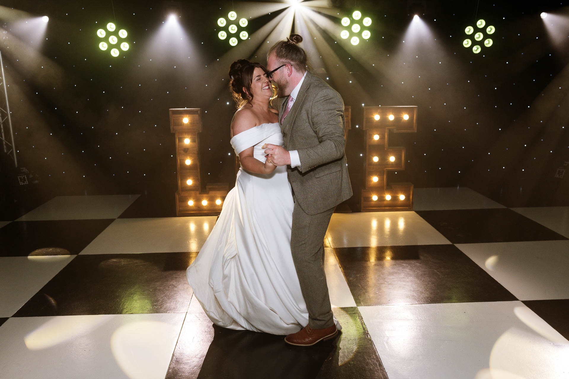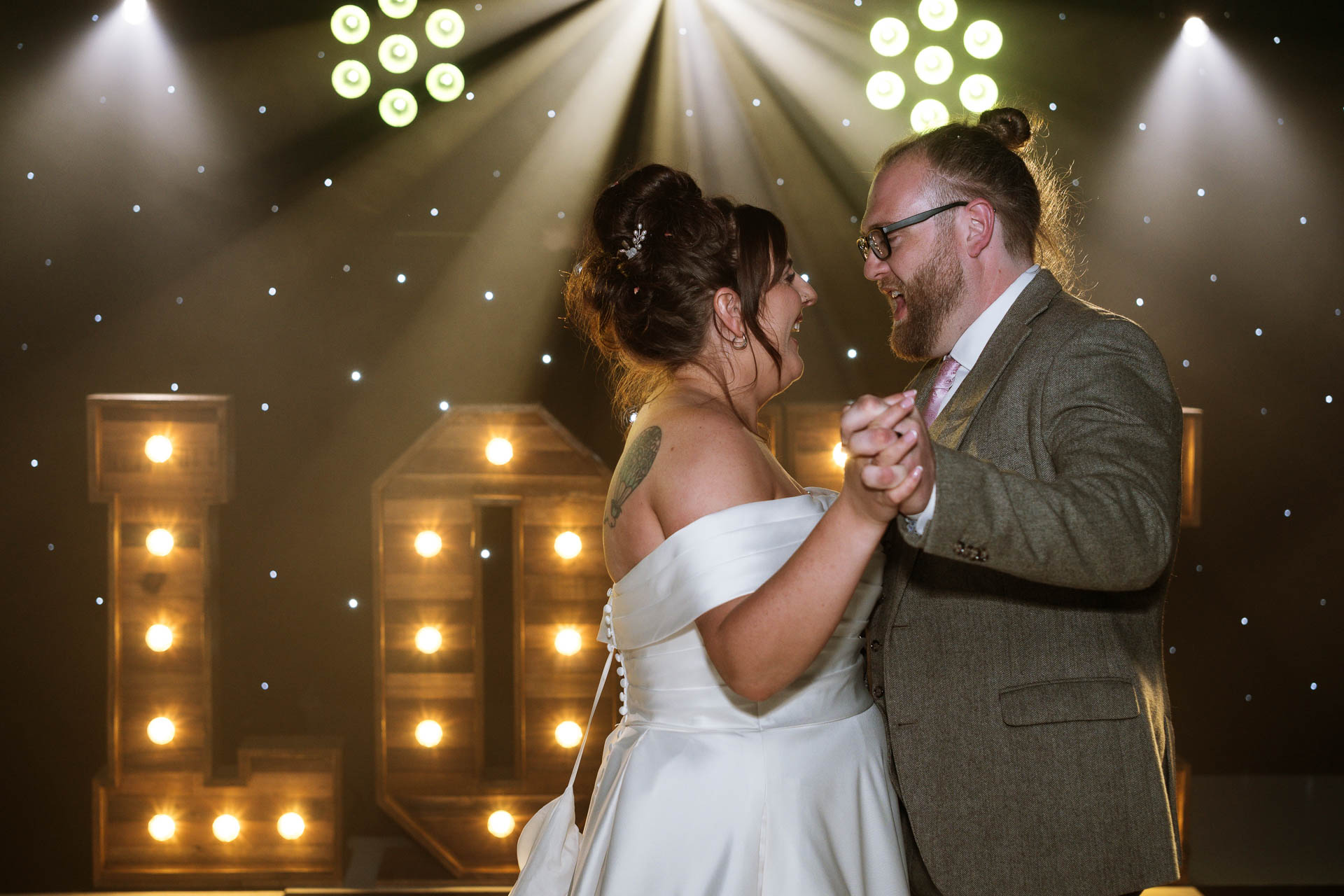 Skye and Ben’s first dance was pure joy. Laughing, leaning into each other, completely lost in the moment under the lights, with their initials glowing behind them. It felt intimate and fun all at once – no pressure, just love.