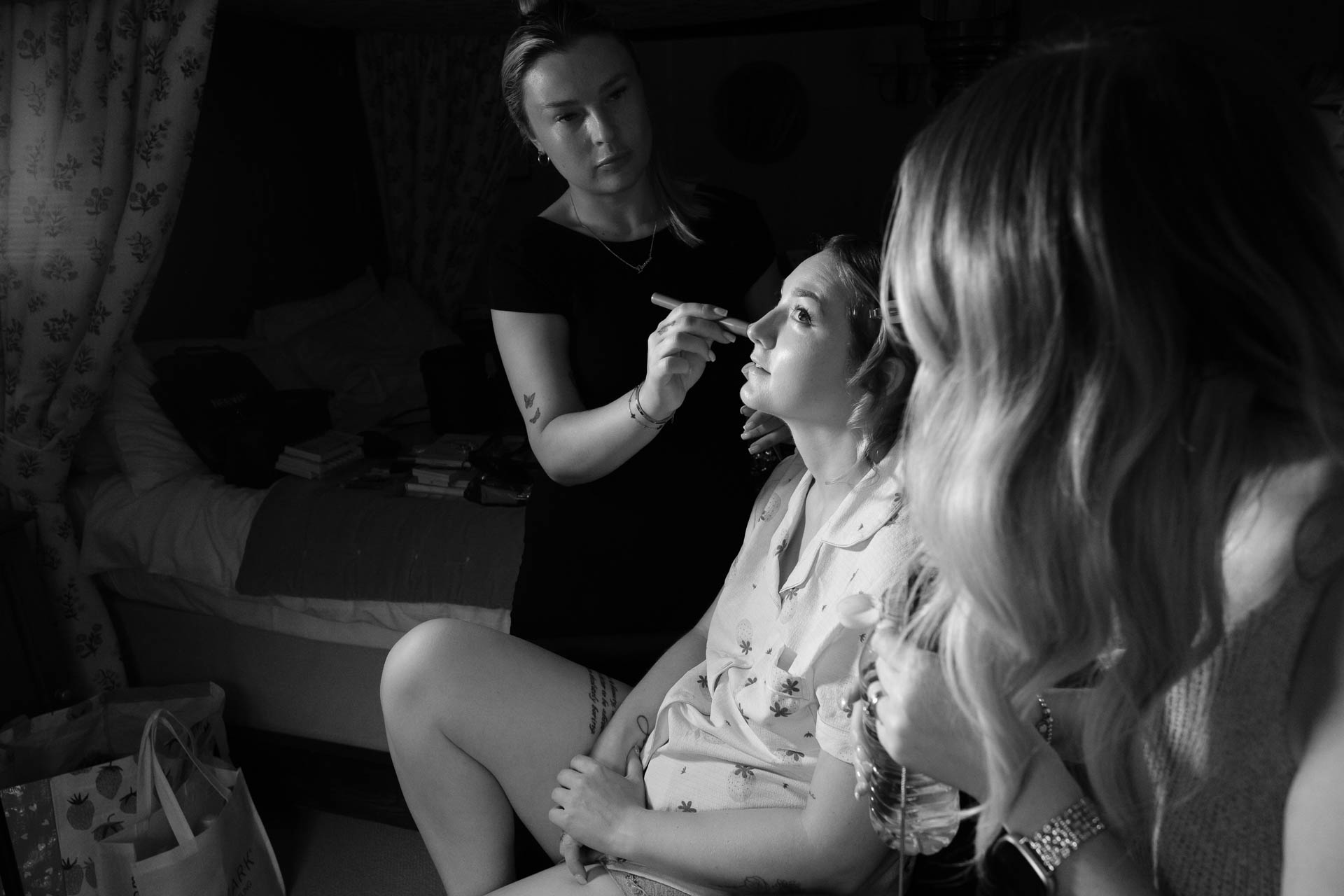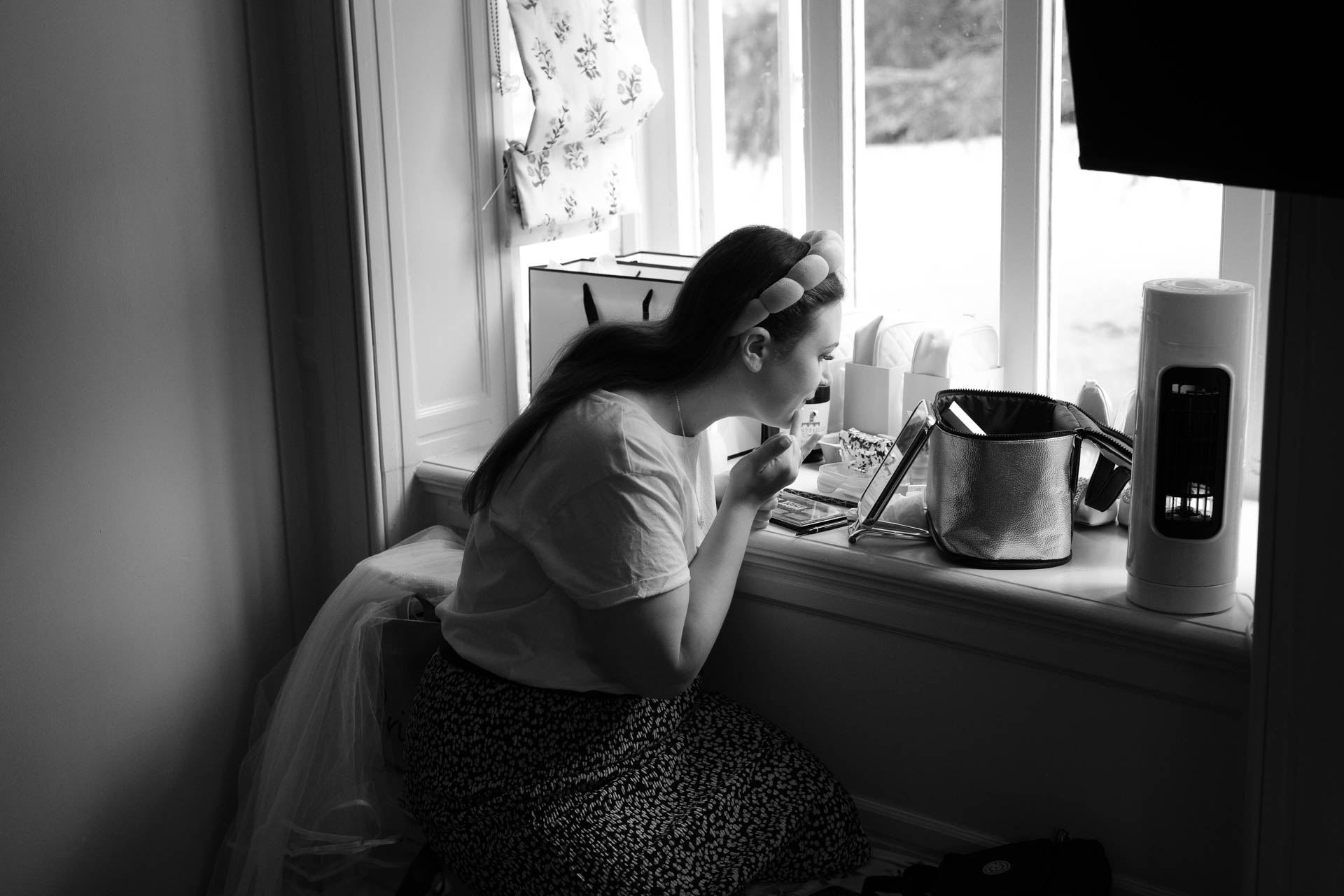 Upstairs, the morning preparations were calm and intimate. Emma perched by the window, finishing her makeup, natural light pouring in as she leaned closer to the mirror. It was one of those peaceful pauses before everything begins – focused, quiet, and full of anticipation.