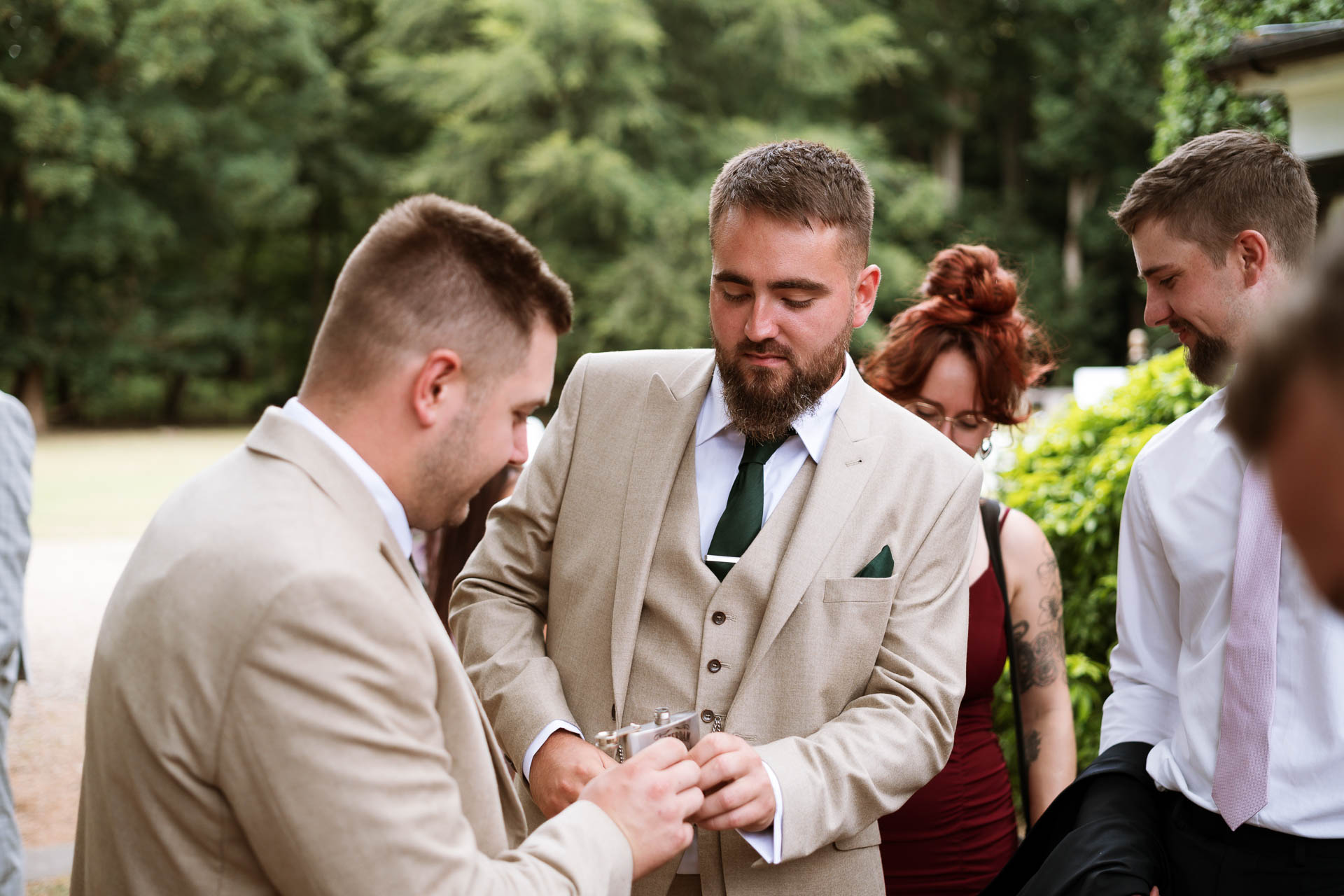 Outside, Harry was deep in conversation with friends, dressed in a relaxed but sharp look that suited the day perfectly. There was a lot of laughter, a few nerves, and a sneaky hip flask making the rounds as everyone soaked up the moment before the ceremony.
