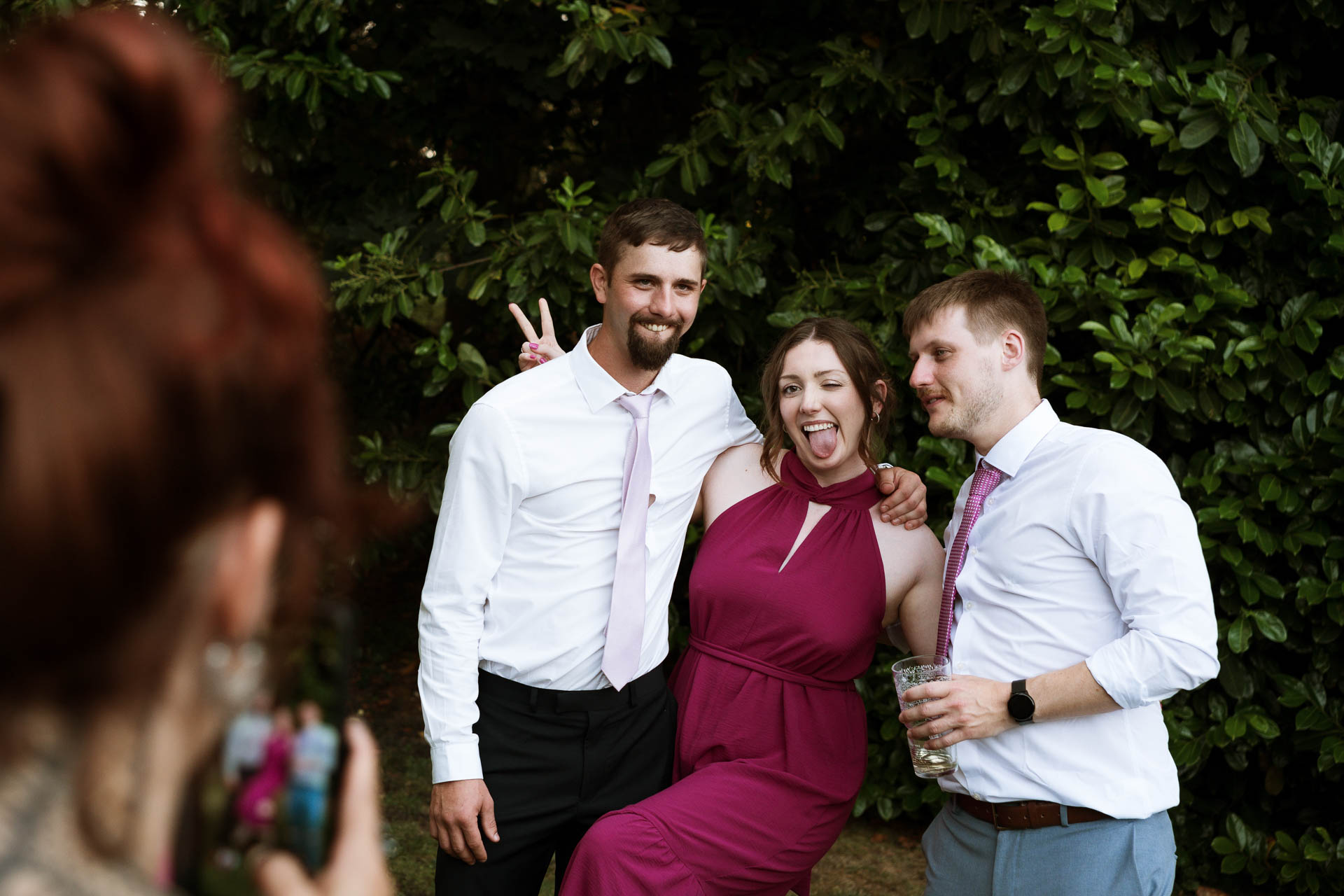 Once everyone was together, the energy really lifted. Guests gathered, drinks in hand, chatting and laughing in the grounds. A group photo moment quickly turned playful, with one guest pulling faces and sticking their tongue out while friends leaned in close – the kind of candid chaos that always makes the best photos.