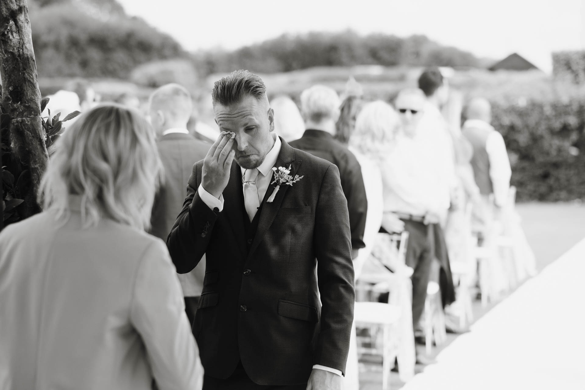 Outside, Lee was having a moment of his own. Standing with guests gathering behind him, he wiped away tears as it all suddenly became very real. No big show, no posing — just a groom feeling everything at once, and not trying to hide it.