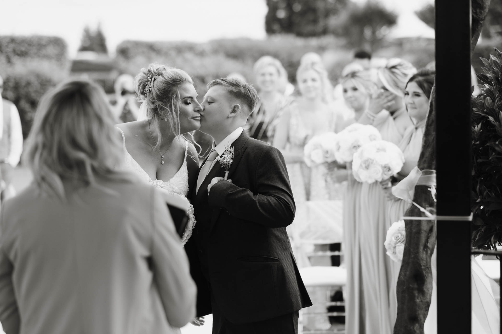 The ceremony itself took place outdoors, framed by blossom trees and bright summer light. Ayesha and Lee walked back up the aisle hand in hand, married, beaming, and completely surrounded by cheers, bubbles, and very proud faces. That just-married glow was in full force here — smiles that didn’t need any prompting.