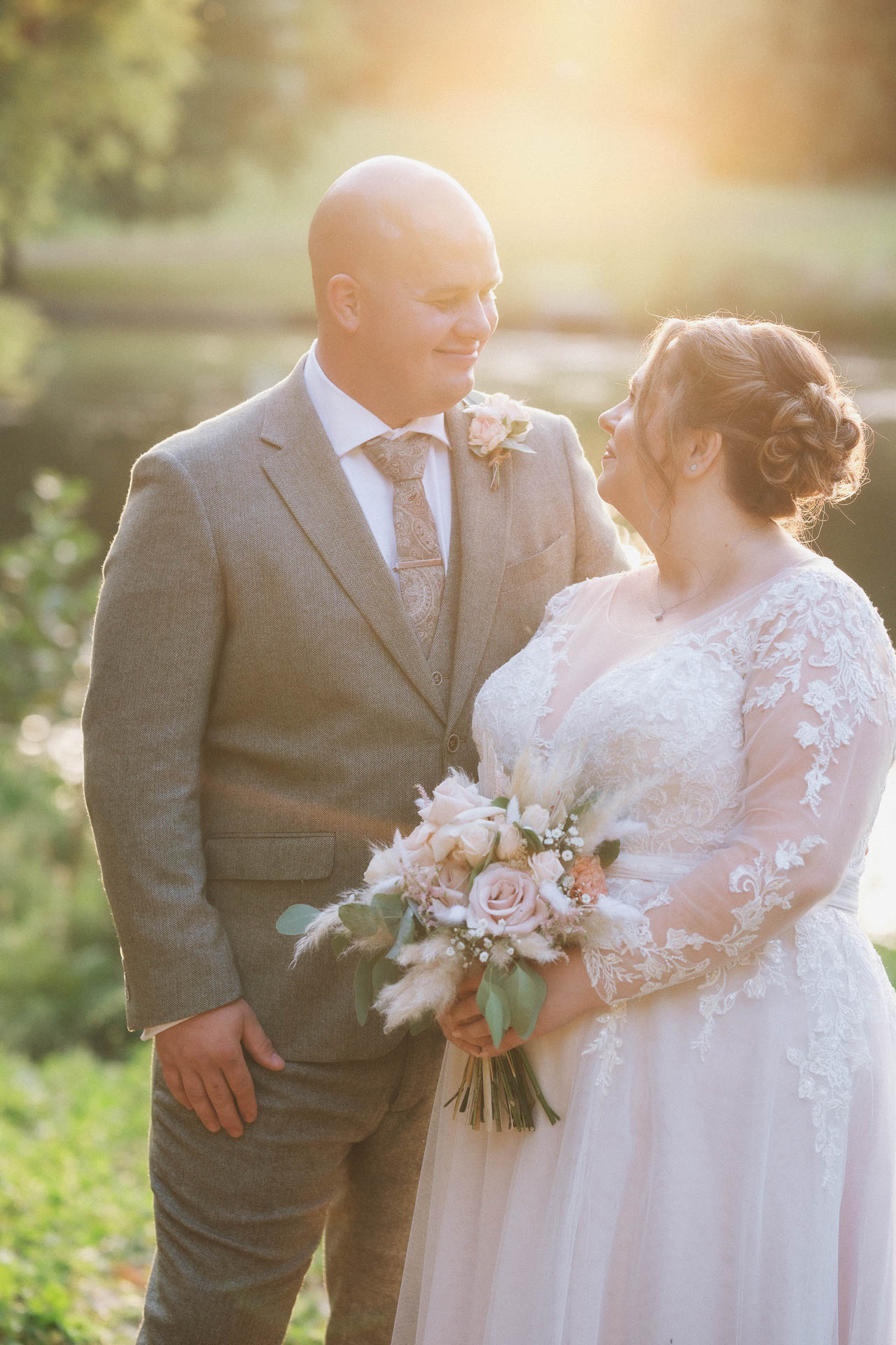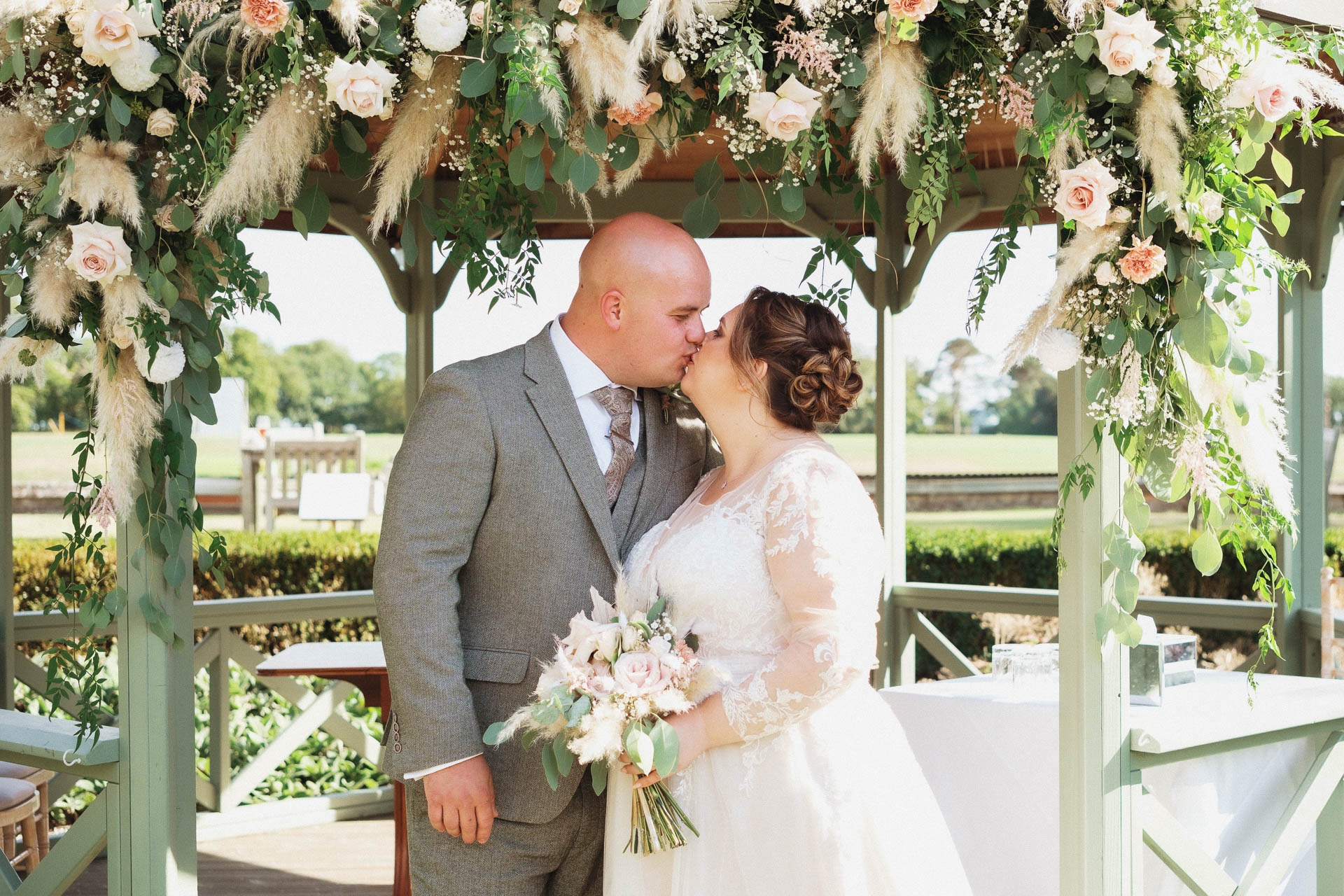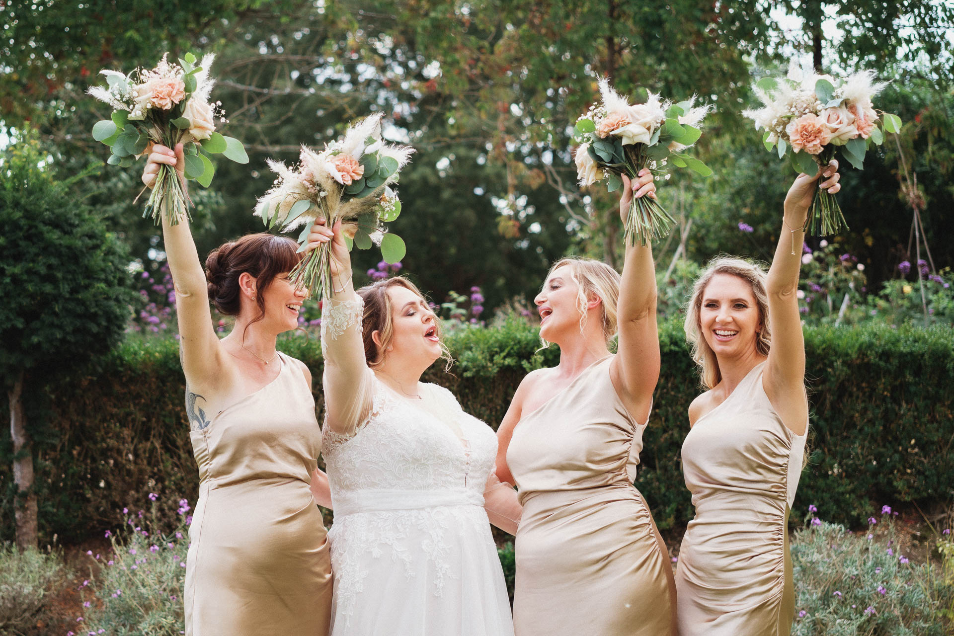 The bridal party joined in for some fun, celebratory photos, bouquets held high and smiles all round. The colour palette of soft neutrals and greenery tied everything together beautifully, complementing both the setting and the relaxed, elegant feel of the day.