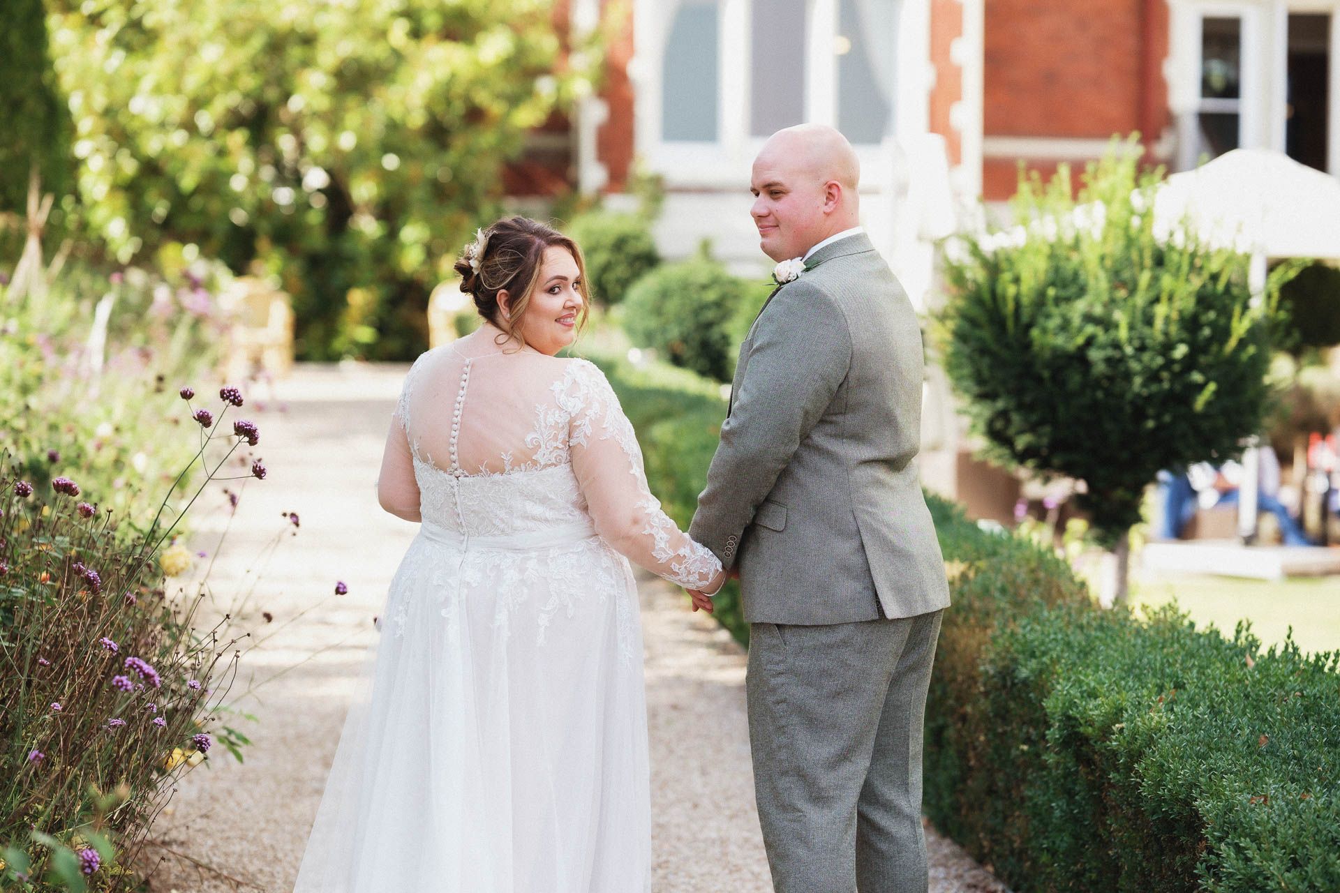 After the ceremony, the celebrations flowed naturally into group photos and time spent together in the gardens. Nicole and Will took a few moments just for themselves, wandering the grounds hand in hand. These portraits felt unforced and genuine – the two of them laughing together, wrapped in golden afternoon light, with Wivenhoe House and the surrounding greenery framing each shot perfectly.