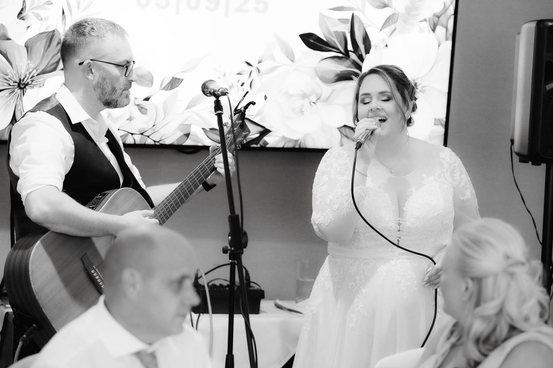 As the evening arrived, everyone moved indoors for the reception. Speeches brought laughter and emotion in equal measure, and later, music filled the room. One particularly special moment saw Nicole take the microphone, singing with confidence and joy, while guests watched on – a personal and unforgettable touch that made the evening feel uniquely theirs.