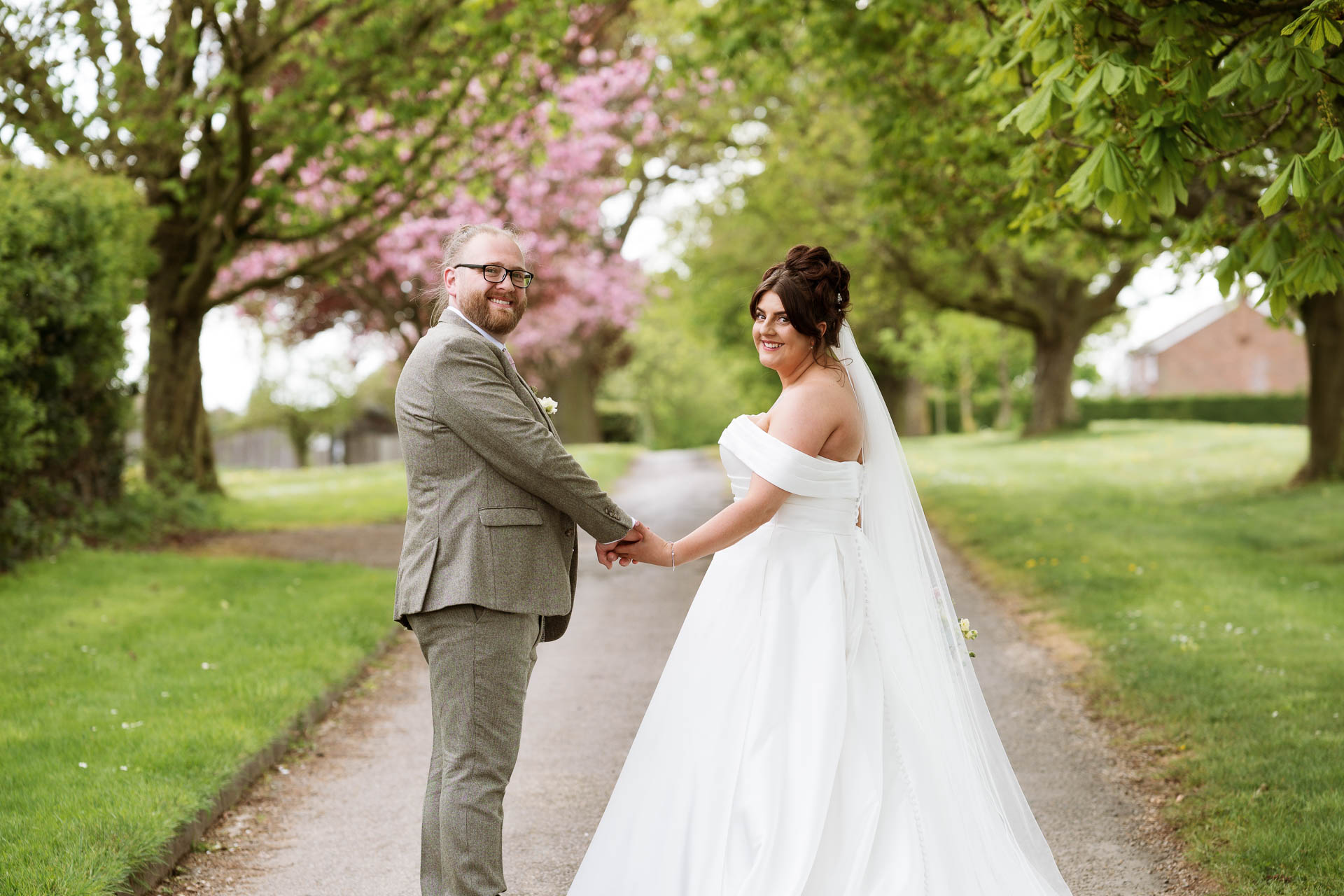 Outside, the spring colours were showing off. Green trees, blossom popping in the background, and that soft light that makes everything feel extra dreamy. Skye and Ben wandered down the path together, holding hands and throwing big smiles back at the camera – one of those ‘we did it!’ moments.