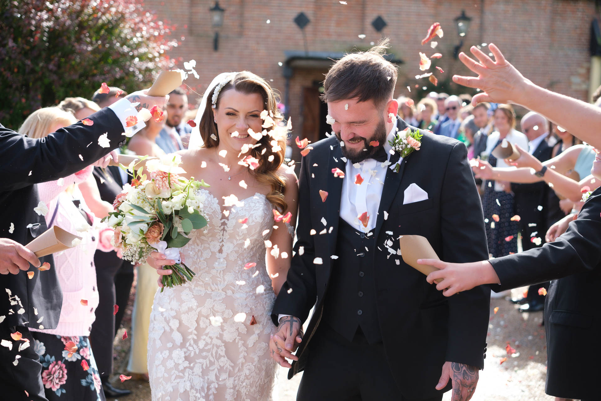 One of the highlights was the confetti moment outside the barn. Guests lined up ready, cones at the ready, and as Hannah and Luke walked through, they were showered in petals and cheers. The photos say it all — Hannah laughing, Luke looking down trying not to get covered completely, confetti flying everywhere, and so much joy packed into one moment.
