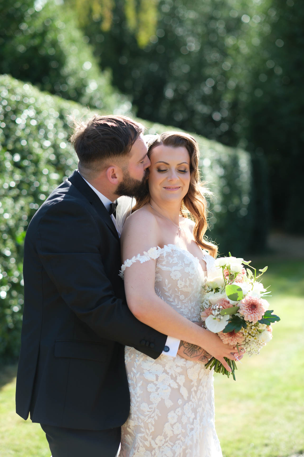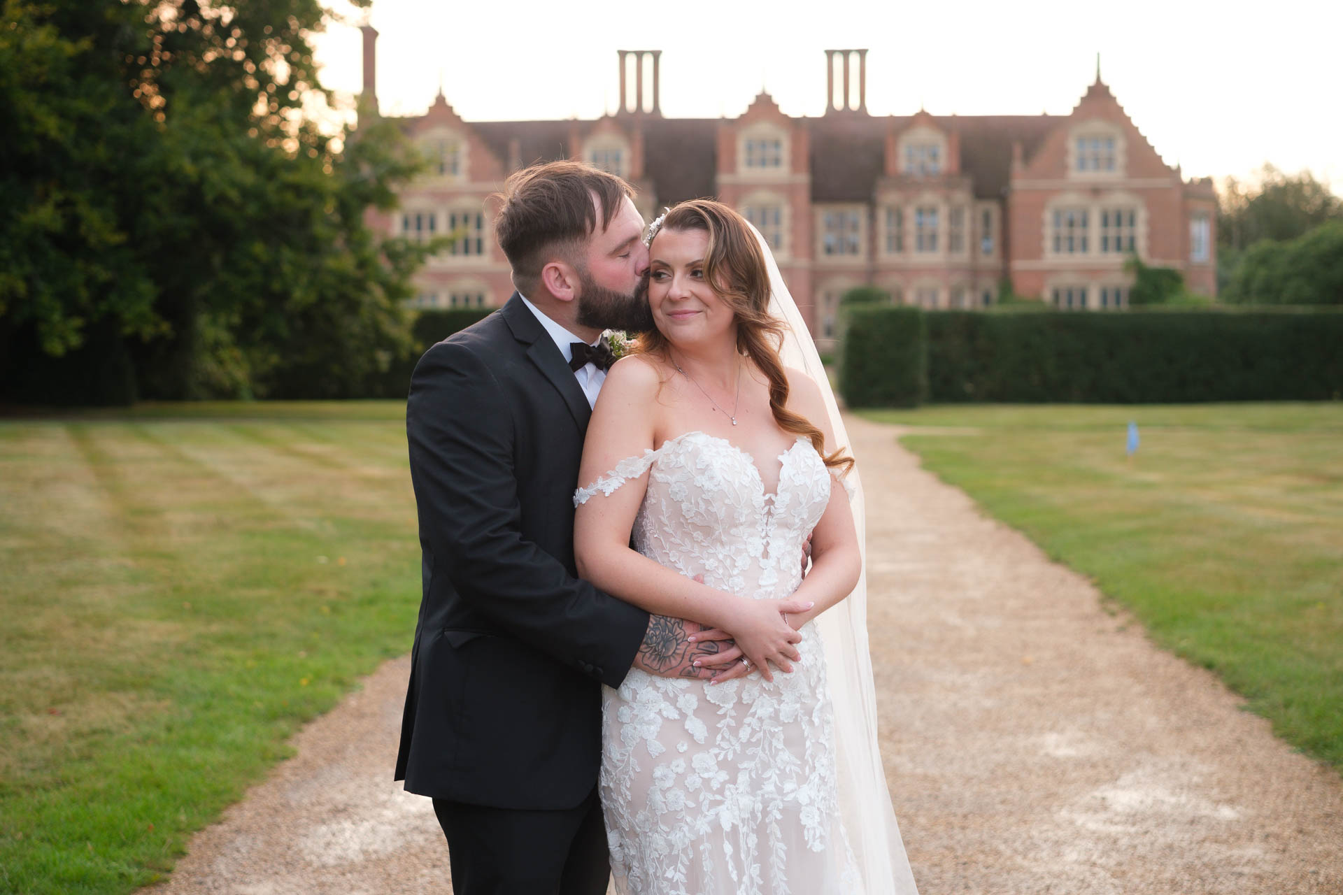 As the day went on, we made the most of the grounds around Haughley Park Barn for some relaxed portraits. The long pathways leading up to the house gave us a beautiful backdrop, especially later in the day when the light softened. Luke sneaking a kiss on Hannah’s cheek while she smiles ahead is one of those moments that feels completely unplanned and totally them.