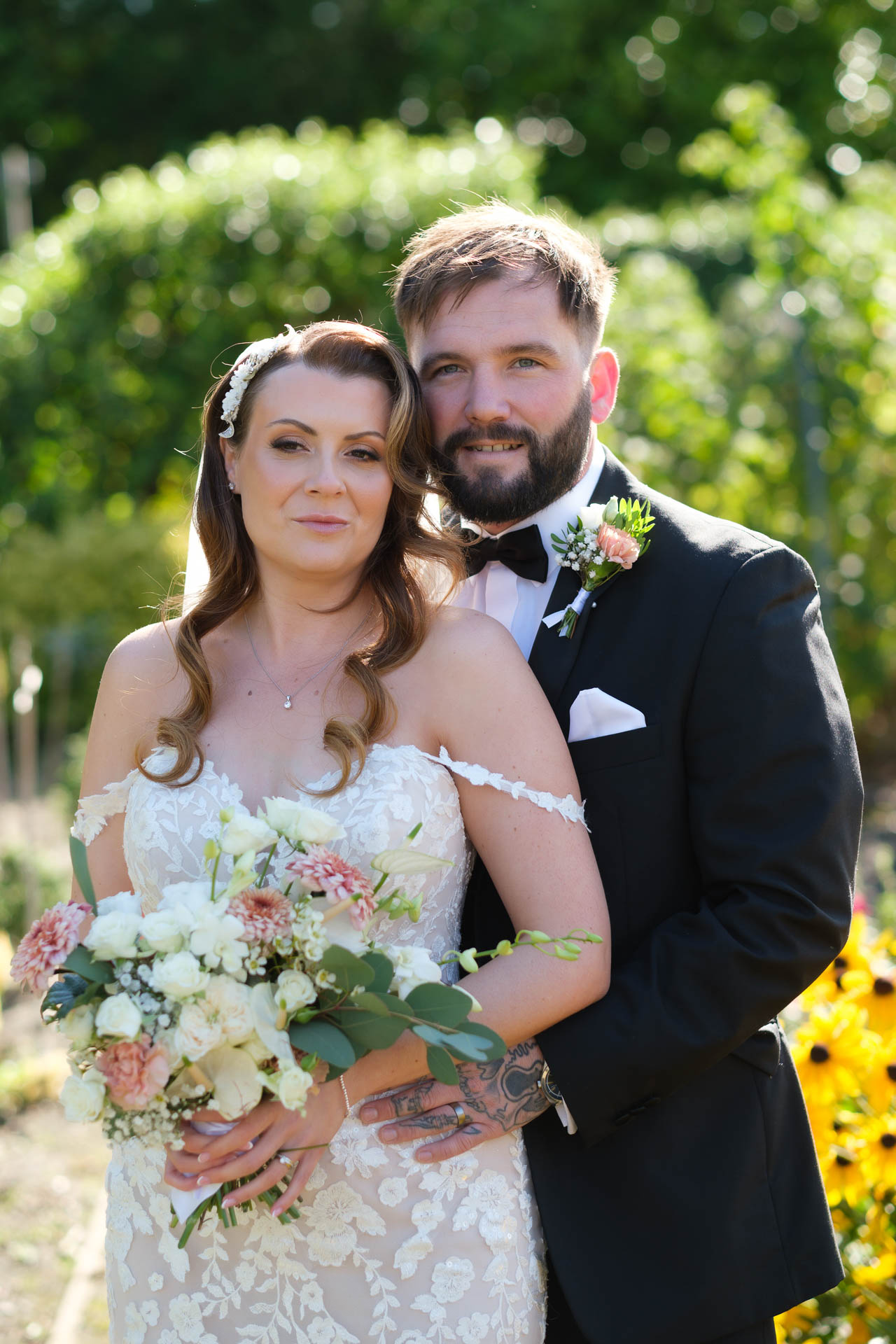 After the ceremony, we headed straight out into the gardens, and honestly, this is where the day really came into its own. Surrounded by greenery, flowers in full bloom and golden sunshine, Hannah and Luke finally had a moment to slow things down a bit. You can see it in the photos — the way Luke wraps his arms around Hannah, the little looks they keep giving each other, and that quiet excitement that hits once it all sinks in.