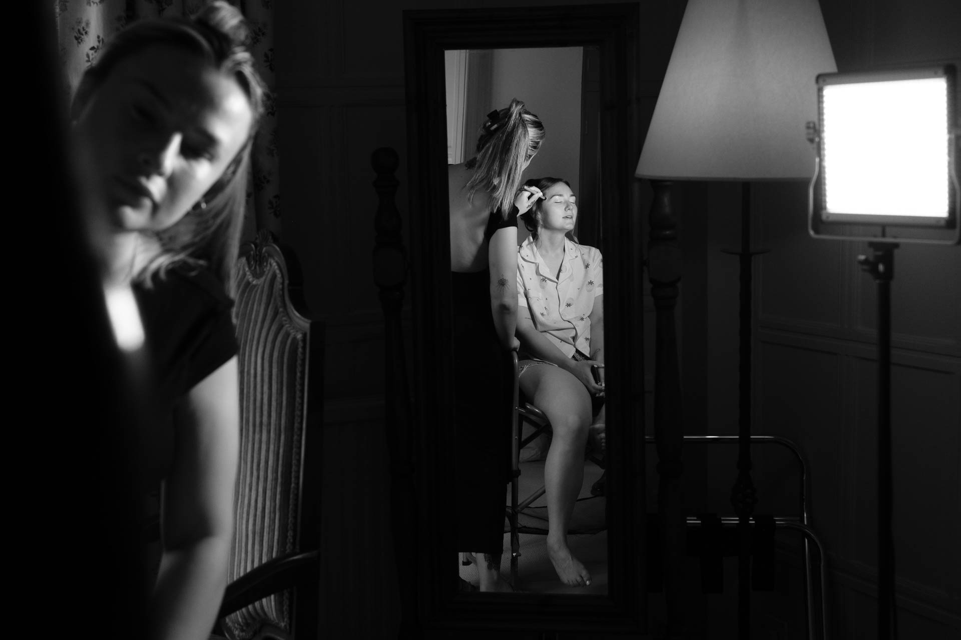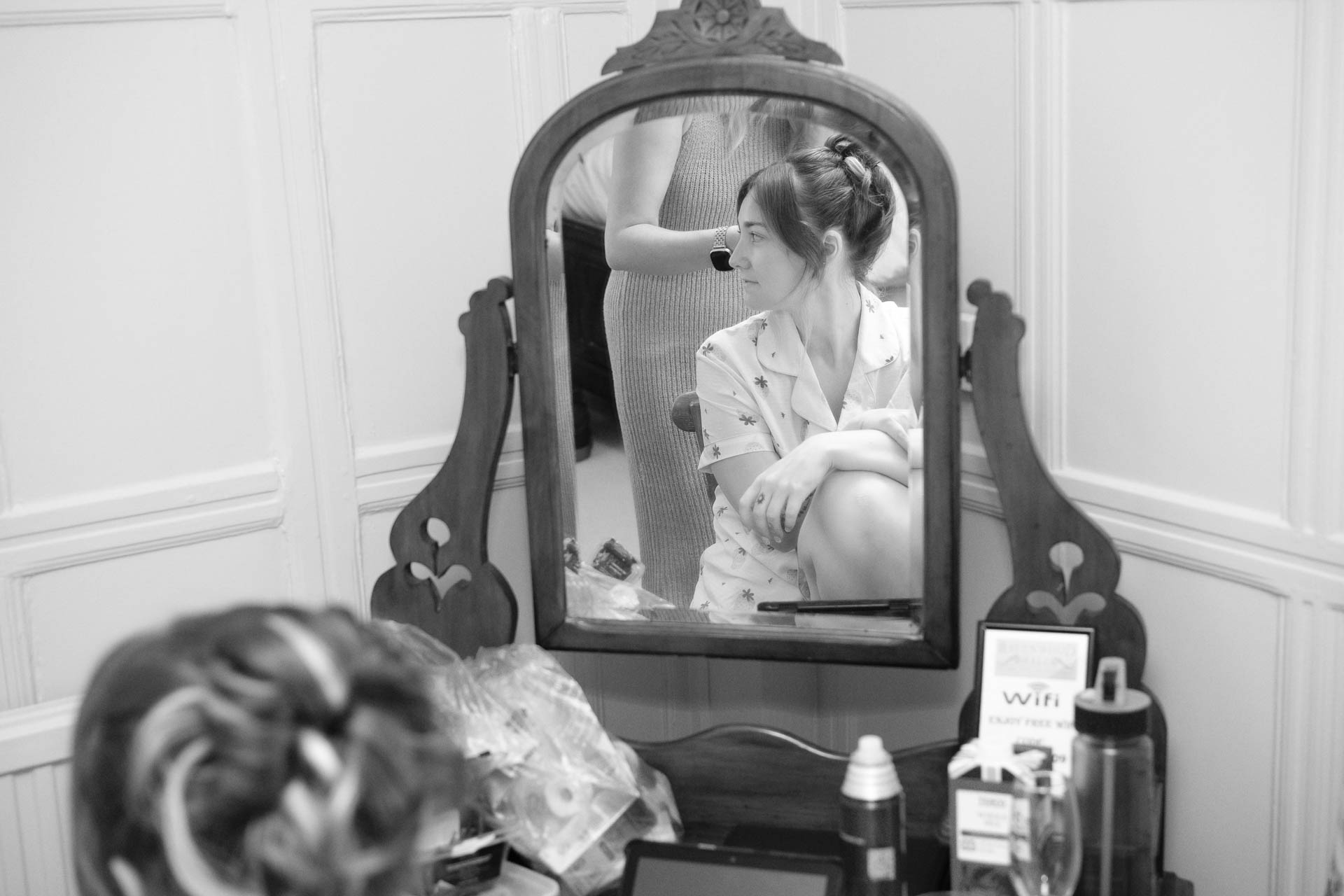 Upstairs, the morning preparations were calm and intimate. Emma perched by the window, finishing her makeup, natural light pouring in as she leaned closer to the mirror. It was one of those peaceful pauses before everything begins – focused, quiet, and full of anticipation.