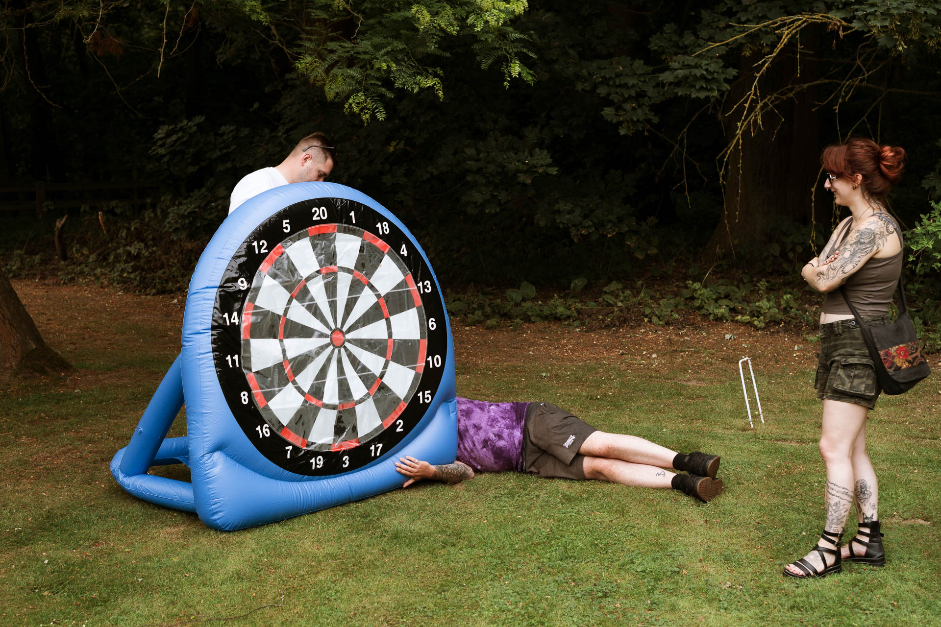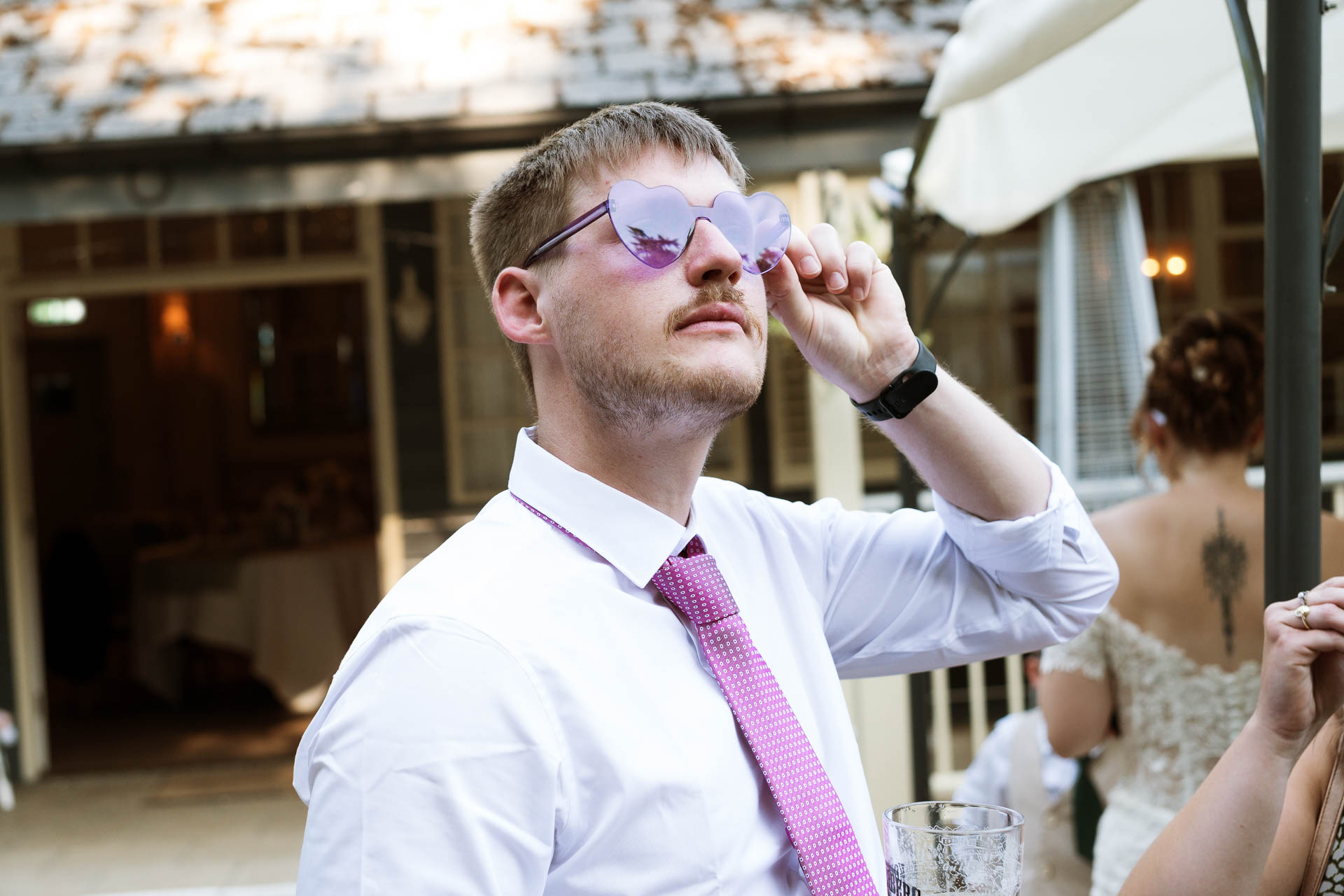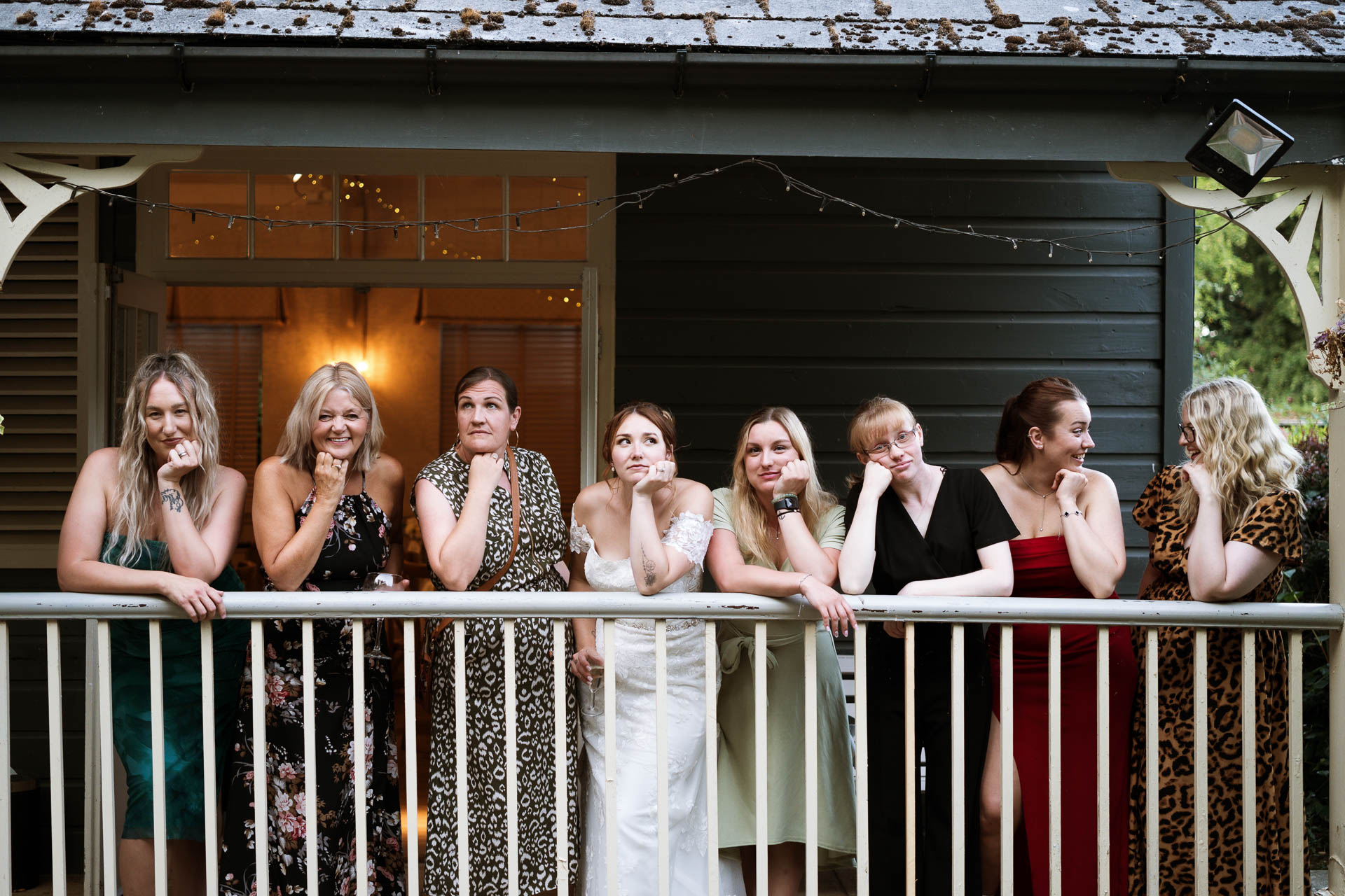 Once everyone was together, the energy really lifted. Guests gathered, drinks in hand, chatting and laughing in the grounds. A group photo moment quickly turned playful, with one guest pulling faces and sticking their tongue out while friends leaned in close – the kind of candid chaos that always makes the best photos.