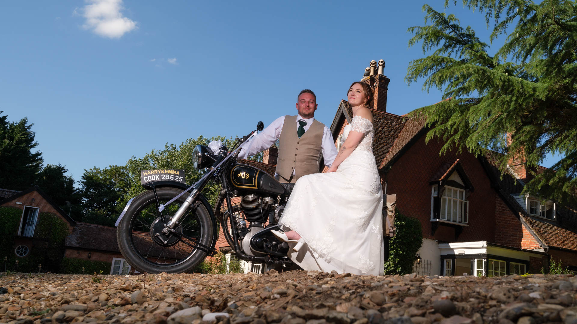 Later on, Emma and Harry took some time together with the bike, posing proudly beside it with Ravenwood Hall behind them. Emma sat side-saddle in her dress, Harry standing close by, both of them looking relaxed, confident, and very happy. It felt cinematic, fun, and completely unique to them.