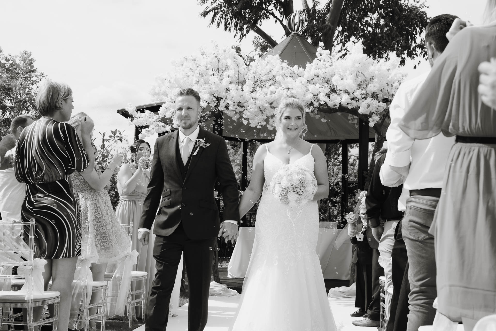 The ceremony itself took place outdoors, framed by blossom trees and bright summer light. Ayesha and Lee walked back up the aisle hand in hand, married, beaming, and completely surrounded by cheers, bubbles, and very proud faces. That just-married glow was in full force here — smiles that didn’t need any prompting.