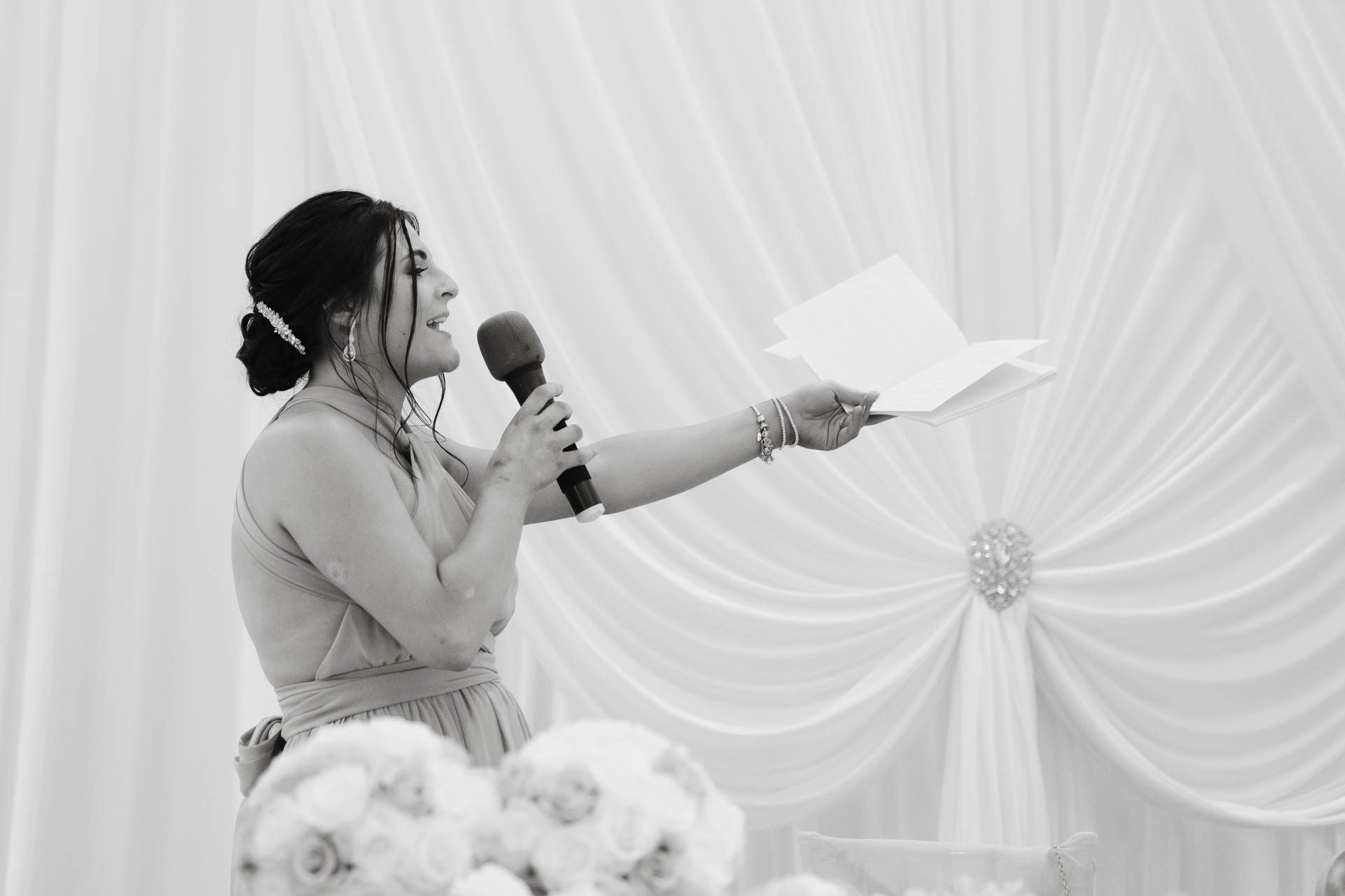 Inside for the speeches, things shifted from emotional to hilarious very quickly. Cue notes being waved around, laughter breaking through mid-sentence, and guests hanging onto every word. Glasses were raised, tears made another appearance (of both the laughing and emotional kind), and Ayesha soaked it all in with that look that says, “This is exactly how I hoped it would feel.”