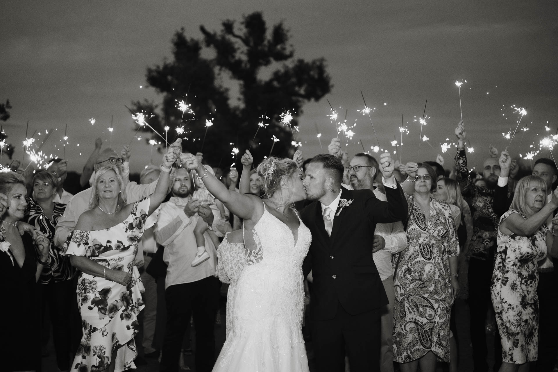 The night finished outside under the darkening sky, with sparklers lighting up the air and Ayesha and Lee right in the middle of it all — arms raised, faces close, sharing one last just-married moment with everyone they love around them.
